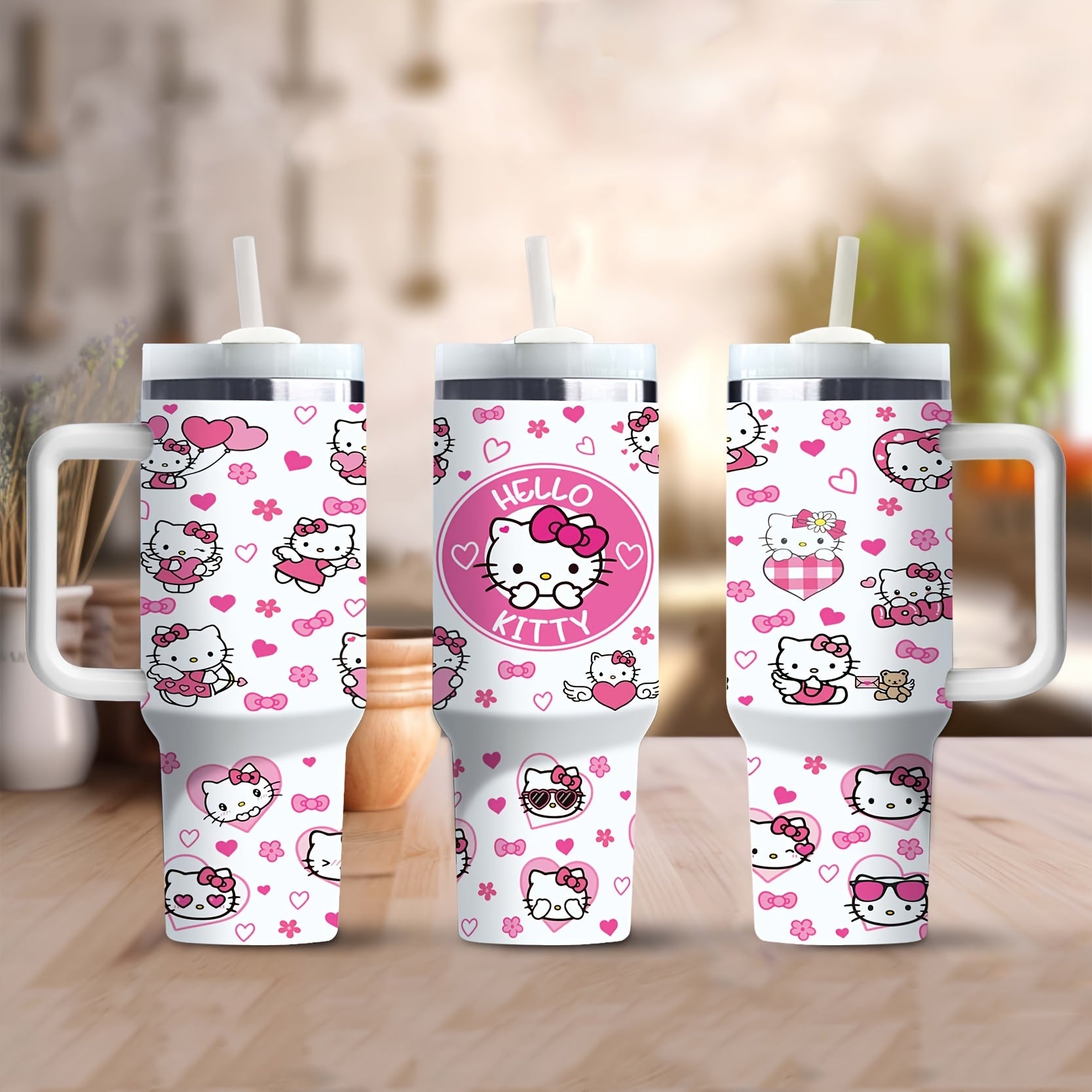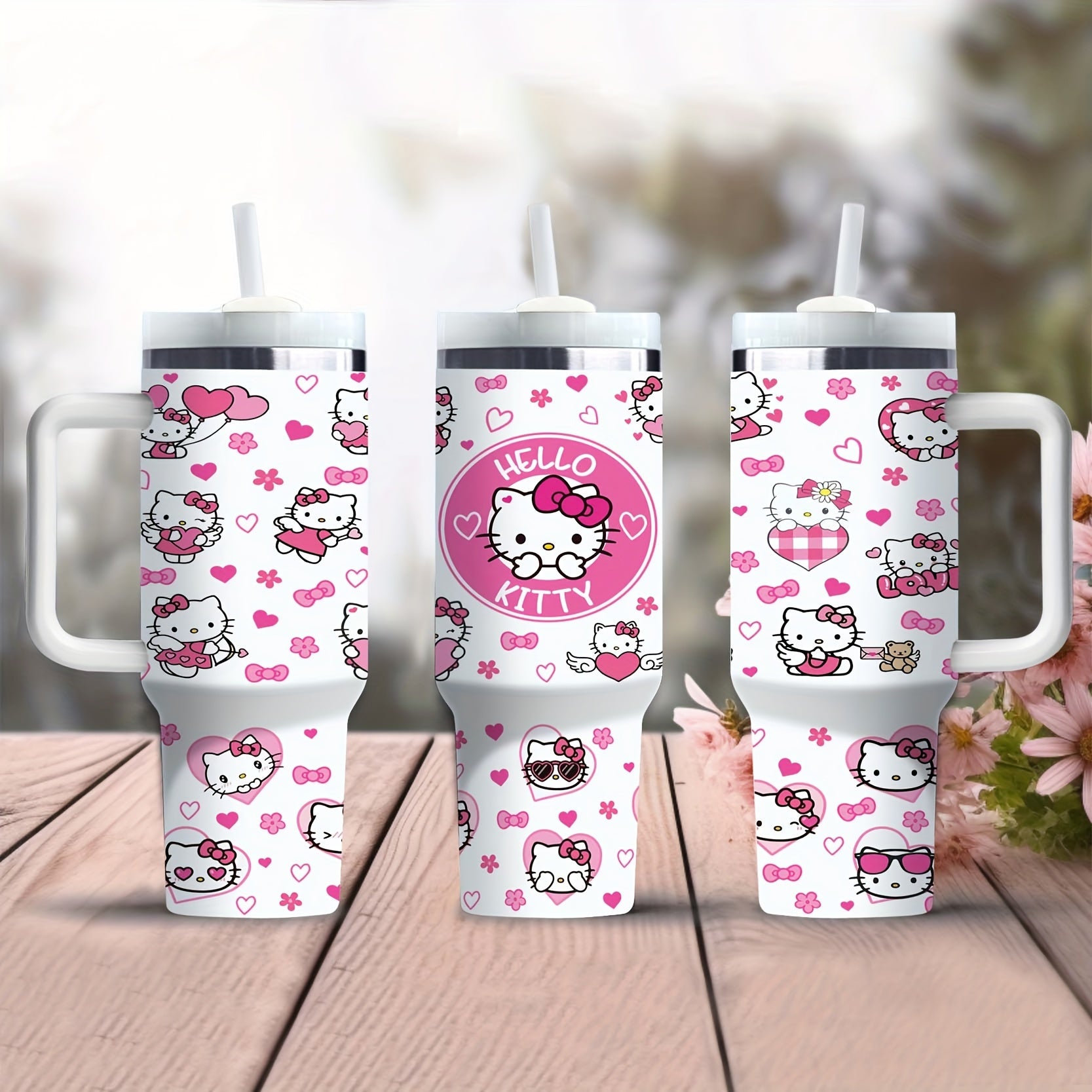 1pc 40oz Cute Hello Kitty with Handle Large Coffee Water Bottle Printed with Katie Cat Pattern Stainless Steel Insulation and Cold Preservation Water Cup Suitable for Gifts to Family and Friends with Straw, The Straw Is Insid